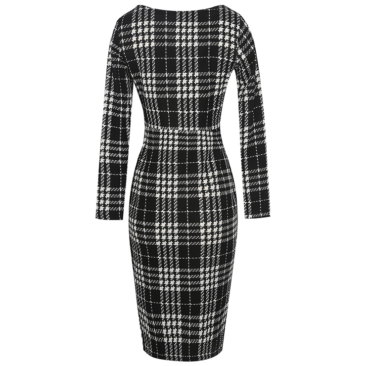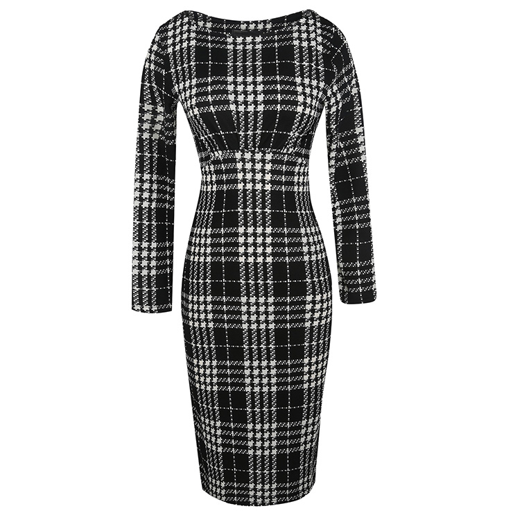 This casual pullover dress featuring long sleeve, round collar, high waist and knee length design, classical black/white plaid pattern cover the whole dress, package hip and bodycon design help to show your figure perfectly. Occasions: suitable for date, go out, office, daily casual and more.