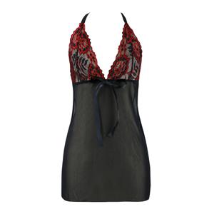 This sexy black babydoll lingerie featuring deep v-neck, spaghetti straps and backless design, red floral pattern and bowknot decoration, made of see-through mesh fabric, it is soft, silky, and comfortable for a wonderful nightwear. Matching g-string.