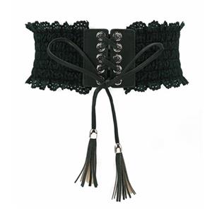 Fashion Elastic Belt featuring front with high quality faux leather panel and lace-up detailing, floral lace elastic band with ruffled hemline, metal press stud button closure at back makes it easy and convenient to wear and take off. This wide waist belt match with tunics, long chiffon blouses or dress, it can highlight your slim waist in a very attractive way.