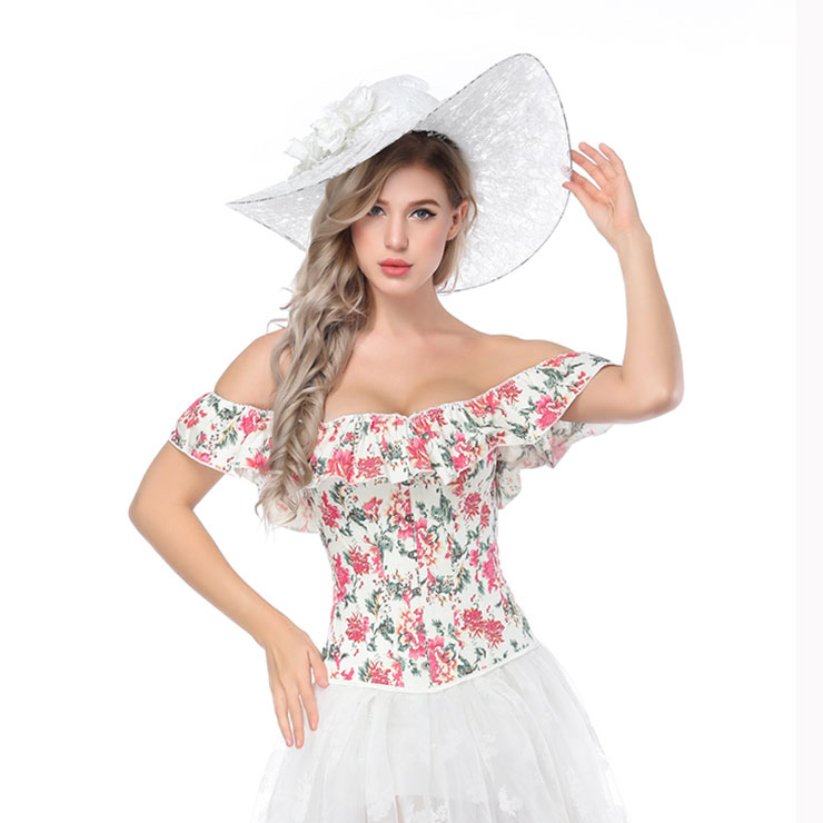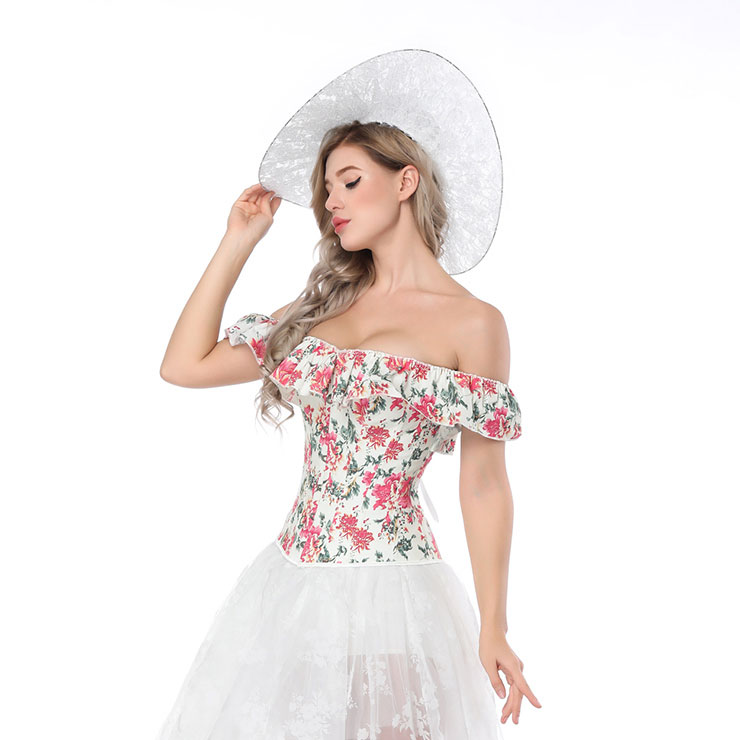 This shapewear corset featuring off shoulder design, elegant floral print pattern cover the whole corset, busk closure in front, lace-up at back for cinching, 14 plastic bones for extra support and shaping, make you look stylish and charming. Suitable for daily casual, go out, party, date and more.(Only the corset)