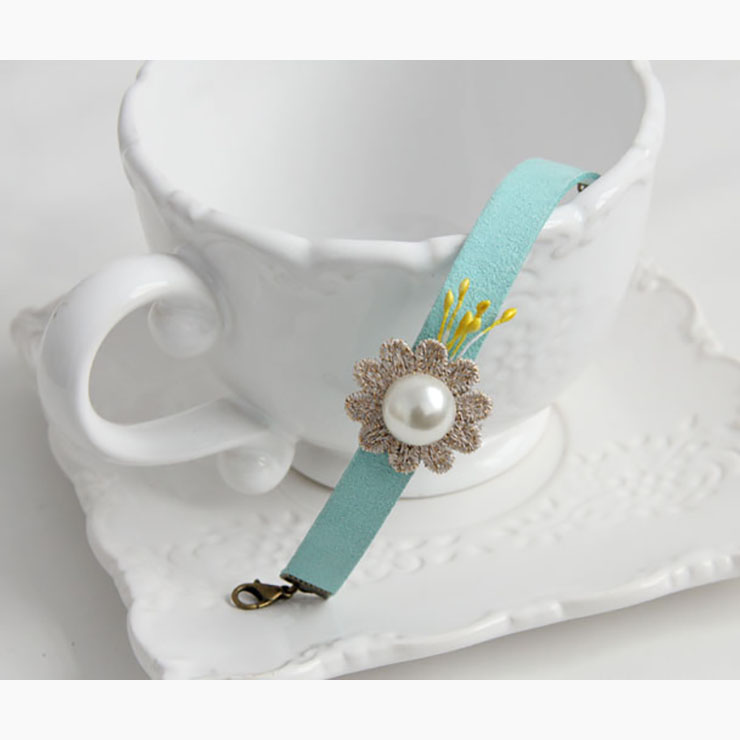 This vintage bracelet features: high qulity pure blue wristband embellish with an exquisite white pearl and lace flower, adjustable bronze chain closure easy to wear.