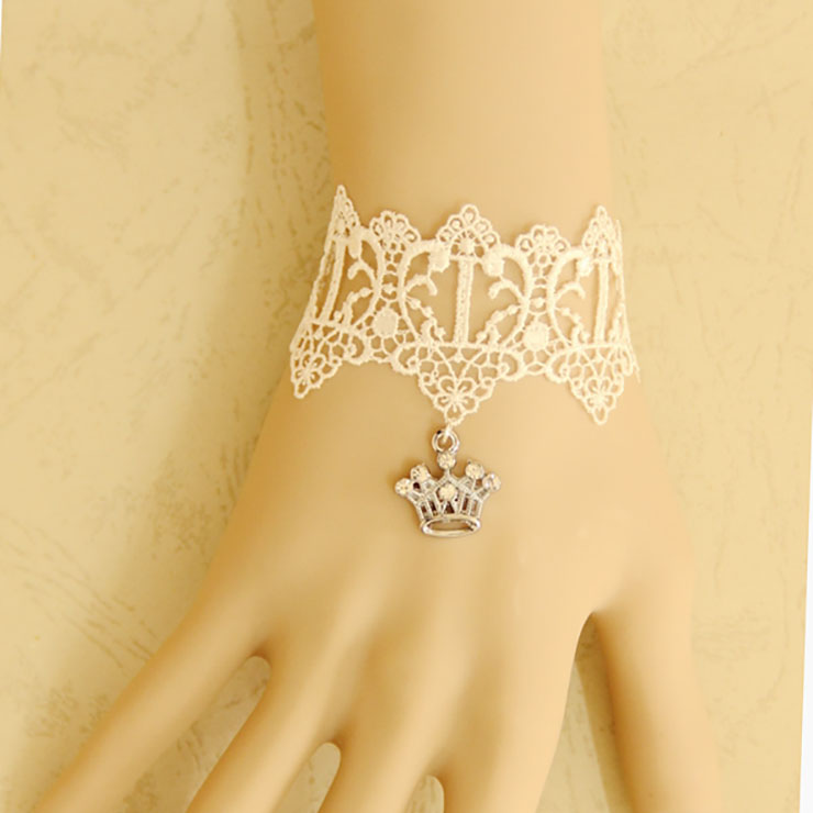 This white lace bracelet features: imperial crown embellishment, delicate white floral lace wristband, retro white metal ring embellishment, adjustable white chain for best-fit.