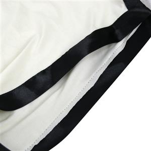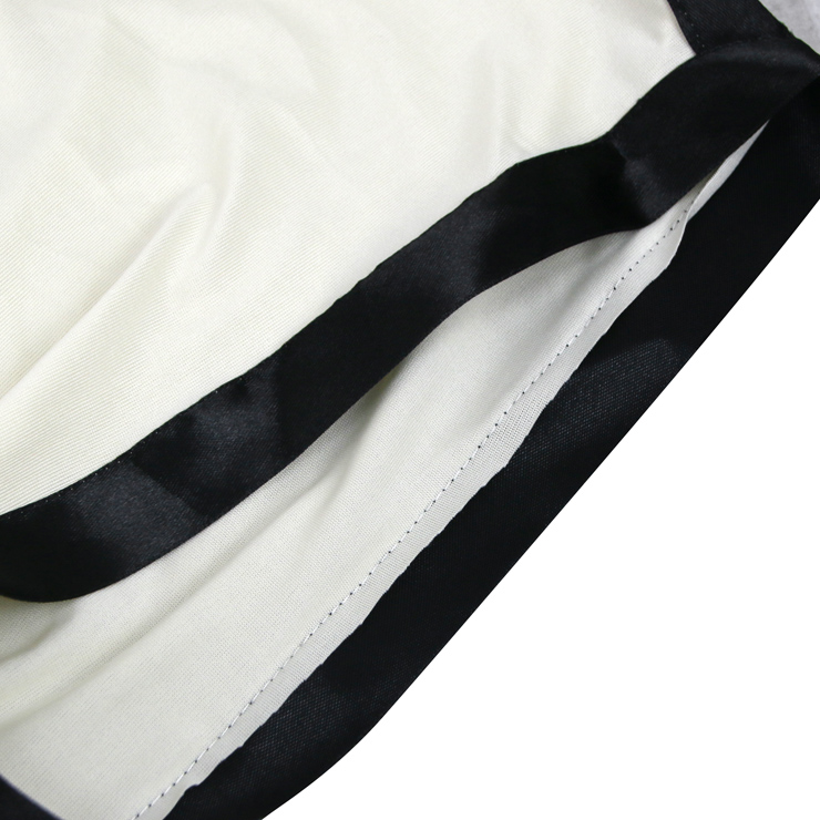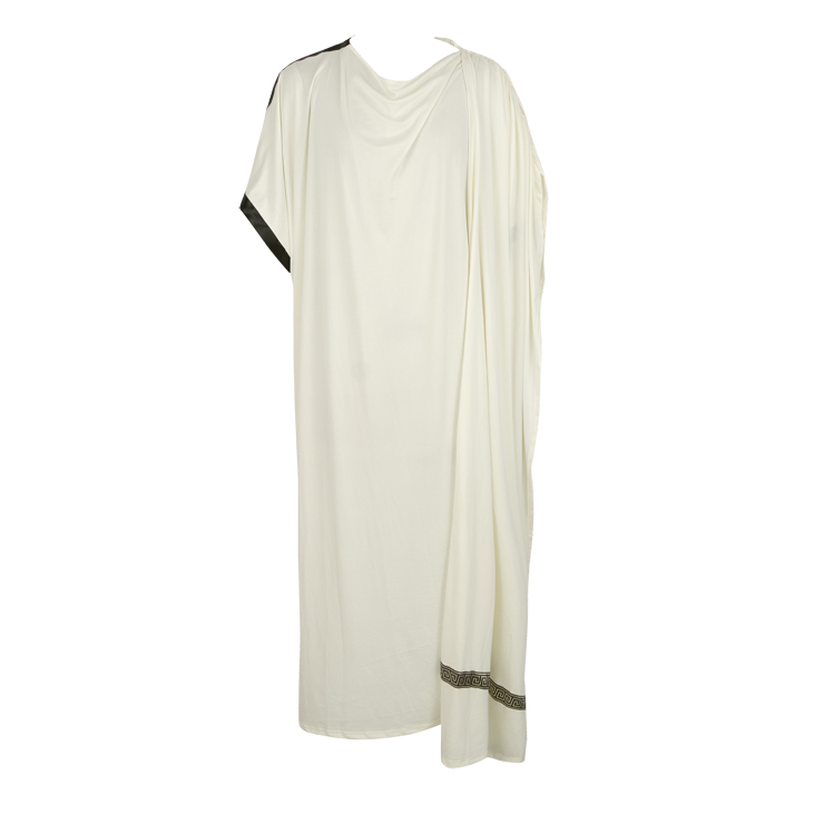 This Men's Greek Toga Costume featuring a long tunic with toga drape at front, short sleeve with black trim, trimmed with black & gold brocade ribbon at waist and hemline (Shoes not included).