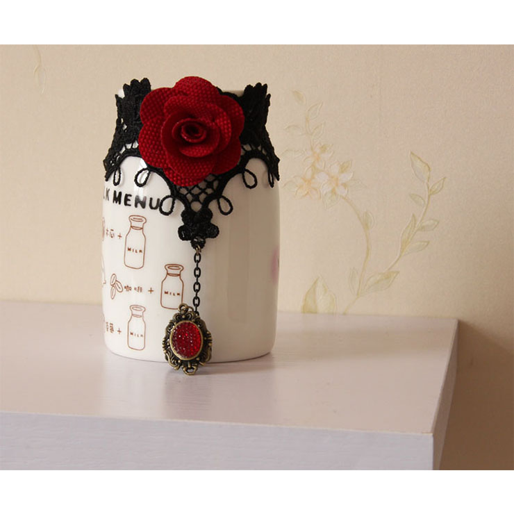 This Victorian Gothic Lace Bracelet features: delicate black lace wristband with Gothic style red rose embellishment, black chain connect with a crafted bronze metal ring embeded with ruby, adjustable bronze metal chain closure easy to wear.