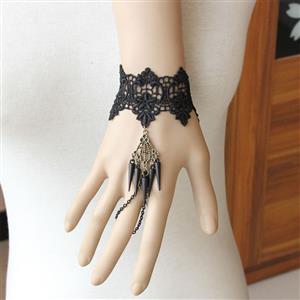 This Victorian Gothic Lace Bracelet features: exquisite black floral lace wristband, crafted bronze metal with five black cone rivets charms, black metal chain fix in your finger, adjustable bronze metal chain closure easy to wear.