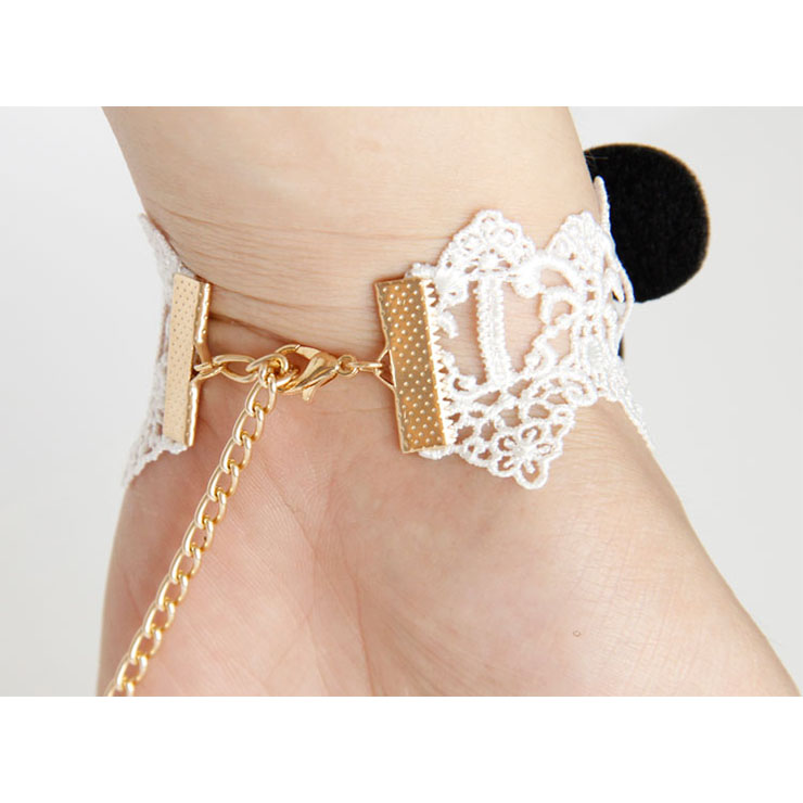 This Vintage Lace Bracelet features: delicate white floral lace wristband with beautiful butterfly, hanging with white bead charms, white metal chain connecting the crafted golden metal ring with white gem embellishment, adjustable golden metal chain closure easy to wear.