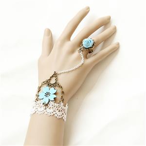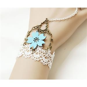 This Vintage Floral Lace Bracelet features: delicate pure white lace wristband, crafted bronze metal surround exquisite blue flower embellishment, white chain connecting the retro bronze metal ring with blue rose, adjustable bronze metal chain closure easy to wear.