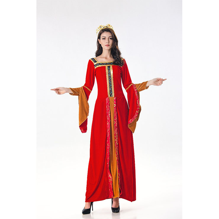 This Renaissance Beauty Costume featuring a red velvet long dress with squre neckline, golden and beads tirming around the bust, cut-out over the waist and the sleeves, Sleeve hems with classical golden trim, concealed back zipper (Only the dress).