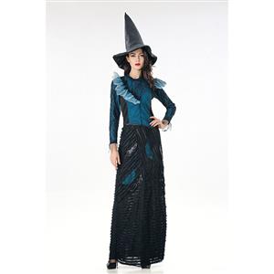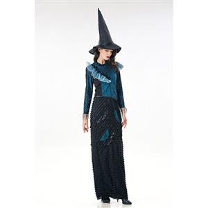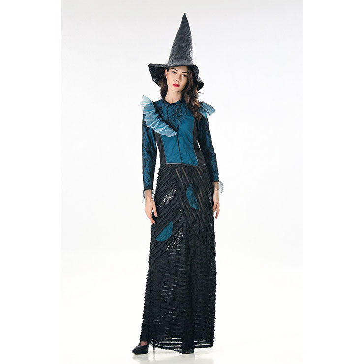 This black witch cosplay costume featuring: dark blue long sleeves shirt with black lace overlay, dark blue and black splice vest with irregular hem, also embellish with blue mesh decoration at bust and one shoulder, black maxi dress with ruffle overlay, matching with a black with hat, it will give you a stylish look this Halloween (High heels not include).