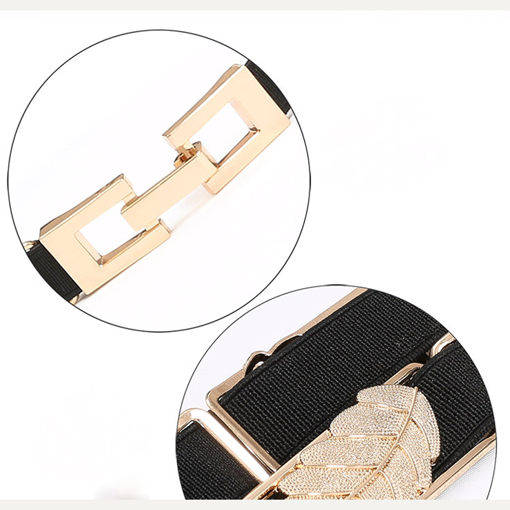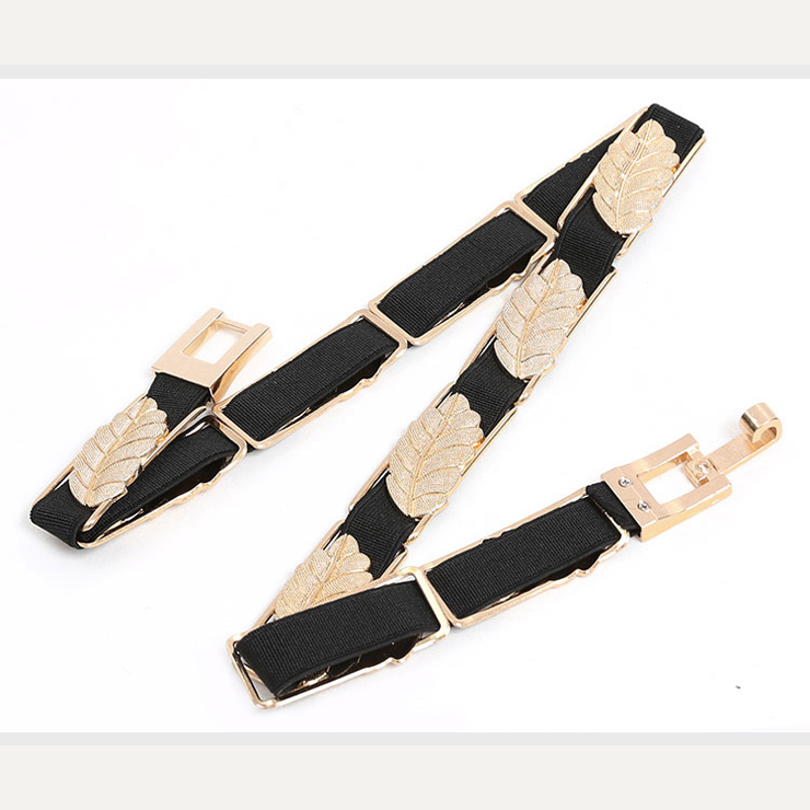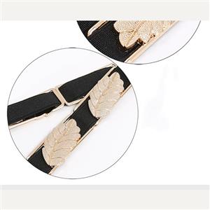 The fashion thin waist belt featuring one size fit most style, delicate alloy gold leaf, so fashion and all-match, front with hook closure, black high elastic belt. Nice to pair with Dress, Jumpsuit, Cardigen, skirts and pants, a fashion accessory for daily or special occasion!
