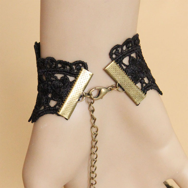 This gothic bracelet features: high quality black lace wristband with embossment, esquisite bronze metal and black drop bead embellished, black metal chain connect with a crafted bronze metal ring with black gem embellishment, adjustable metal chain closure for easy wearing.