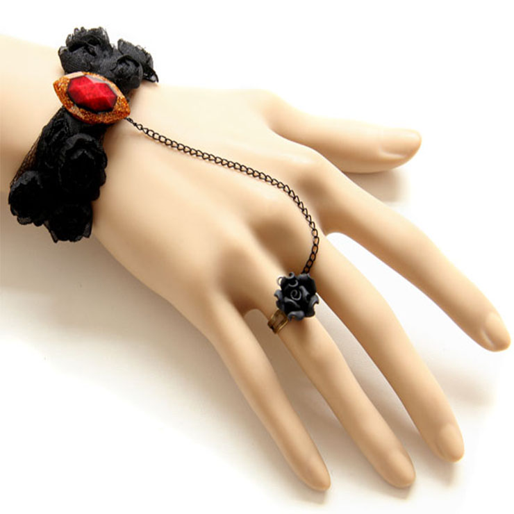 This gothic bracelet features: high quality black lace wristband with several black rose and olive-shape red gem, black metal chain connect with a crafted bronze metal ring with a black rose embellishment, adjustable metal chain closure for easy wearing.