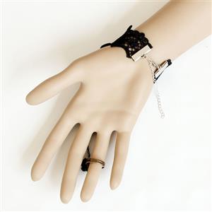 This Gothic Lace Bracelet features: delicate black floral lace wristband with two pink roses embellishment, also hanging with black bead charms, black metal chain connecting a metal ring with black rose, adjustable metal chain closure for easy wearing.