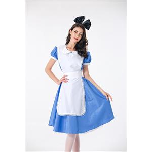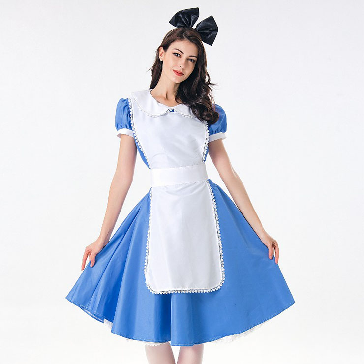 Lovely House Maid Costume featuring a light blue knee-length dress with puff sleeves and lace triming turn down collar, white lace triming apron with tie bow at back, matching black bowknot headpiece, perfect for Halloween, Cosplay, Performance, Carnival and other special occasions (High heels not include).