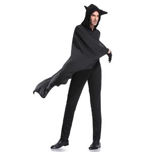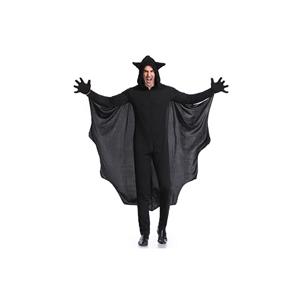 2Pcs. Men's Black Bat Adult Costume featuring a black jumpsuit with front zipper, sewn-on ears at hood and bat wings at back, matching black gloves. Suitable for Halloween, role play party, performence and other special occasions. (Shoes are not included)