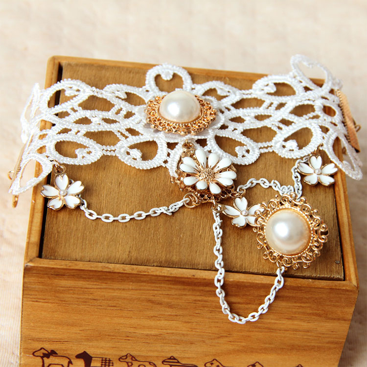This Retro Bracelet features: high quality white floral wristband with a delicate metal embellished with white gem and flower charms, white metal chain connecting a crafted bronze metal gem ring with white gem embellishment, adjustable metal chain closure for easy wearing.
