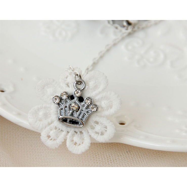 This Retro Lace Bracelet features: elegant white floral lace wristband with vintage figure motif, also hanging with a crafted silver Sun charms, white metal chain connecting a metal ring with white flower lace and silver crown embellishment, adjustable metal chain closure for easy wearing.