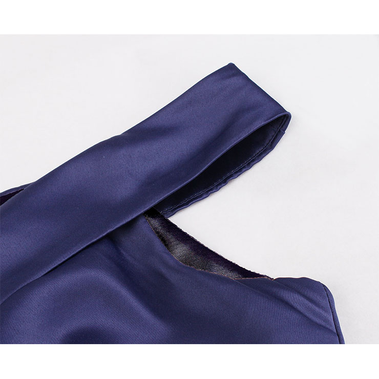This Vintage Dress features: made of elegant dark blue fabric, noble off-shoulder design, pleated bodice, high waist A-line form and asymmetrical high low hemline, concealed zipper closure on the side. Perfect for Wedding Party, Cocktail Party, Ball, dating, daily casual and other occasions.
