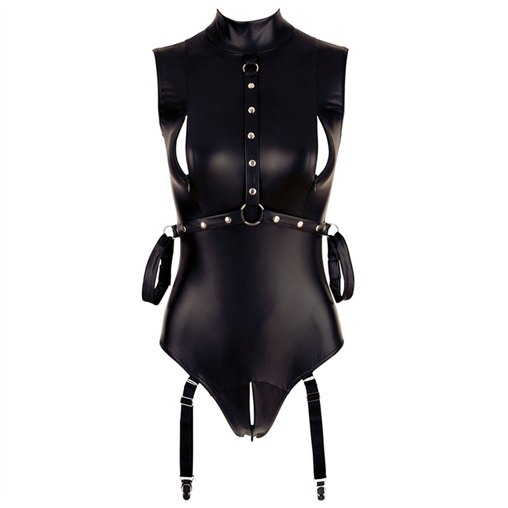 Made of glossy and stretchy PU leather material, this sexy teddies features high collar and sleeveless, zippers at the front and bottom could be open so that revealing your mysterious parts, harness with studs from neck to underbust interlaced by two O-rings, tie-up at the arms like bondage, concealed zipper closure at back, matching garters. Suitable for Bar, Cosplay, Pole Dancing, Halloween, Nightclub, Party and other occasions.