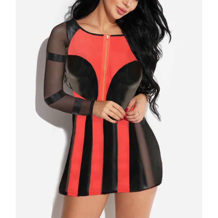 Women's sexy clubwear dress features: sexy black see-through mesh and red color block, long sleeves with black straps, sexy front zipper closure, round neck and mini length, stretchy fabric and slim-fitting show your body curve perfectly. Suitable for Bar, Nightclub, Party, Evening Gathering, daily casual and other occasions.