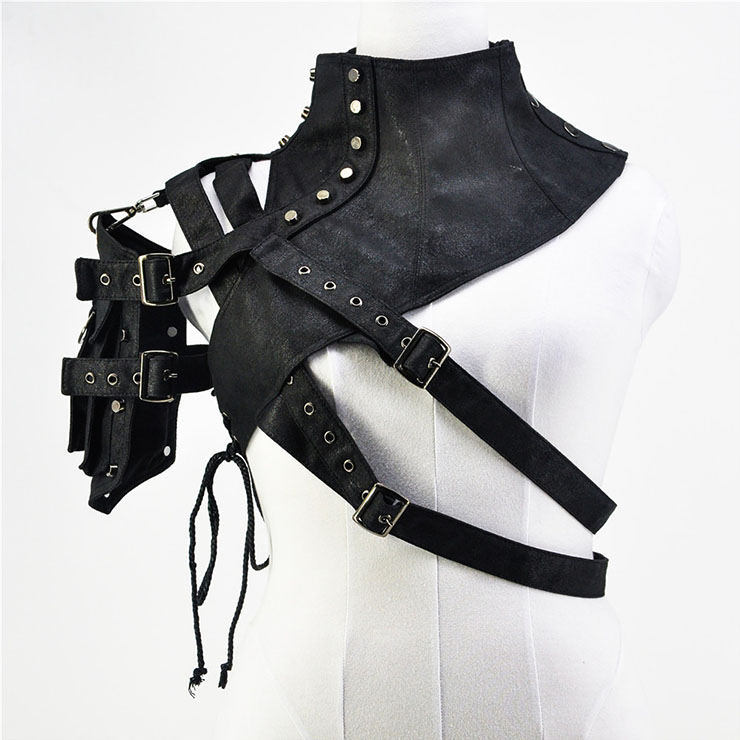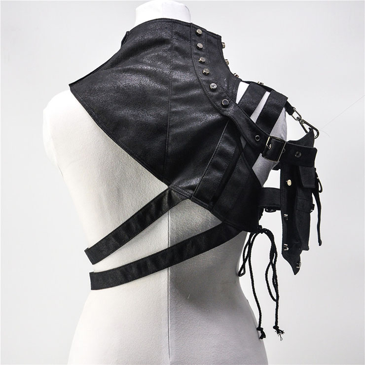 This black shrug featuring high quality PU leather, unique one-shoulder design, two strap with eyelets and buckles link from the right shoulder to the back, another two straps with rivets and buckle link with the armlet. Perfect match with steampunk or retro style corset.