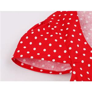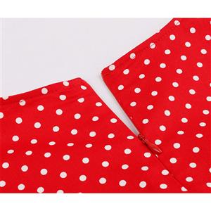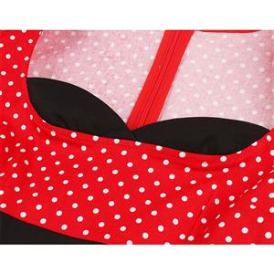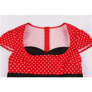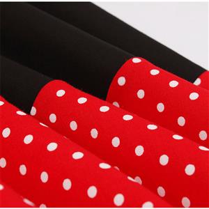 This Vintage Dress features unique designed heart-shaped bodice, simple cape sleeves, red dress with white polka dots, splicing with wide black strips on the waist and skirt, high waistline and A-line form swing skirt make you slim and elegant, concealed zipper closure on the back.