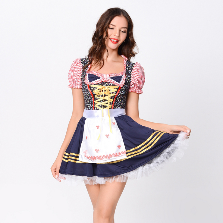 Women's Oktoberfest Beer Girl Adult Costume features: false two-piece peasant style dress with plaid and floral bodice, puff sleeves and lace-up detail, mini skirt with classical golden trim, back zipper closure, matching floral trim apron. (Toy beer mug not included)