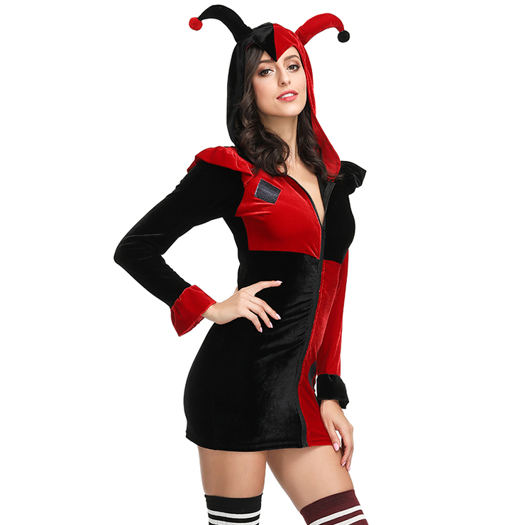 This Adult Joker Costume comes with a black and red matched mini hooded dress with diamond patterns on the front, long sleeve with flared cuffs, stitched with joker's hood, front zipper closure. (Stockings are not included)