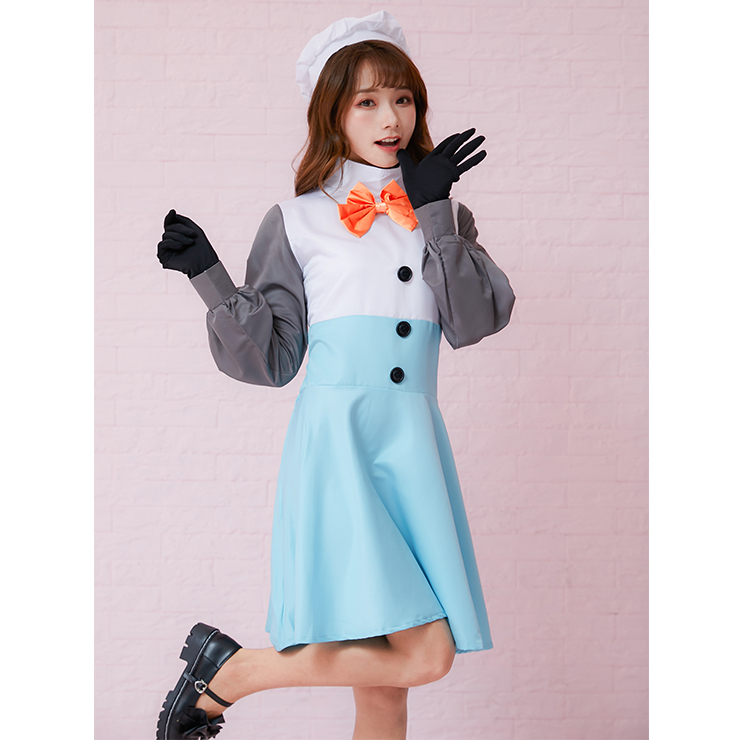 This Adorable Snowman dress features high neck white and light-blue spliced mini dress, gray long puff sleeves, lovely bowknot and buttons decorated, high waist, back elastic band and mini length show your body curve, matching hat and gloves.