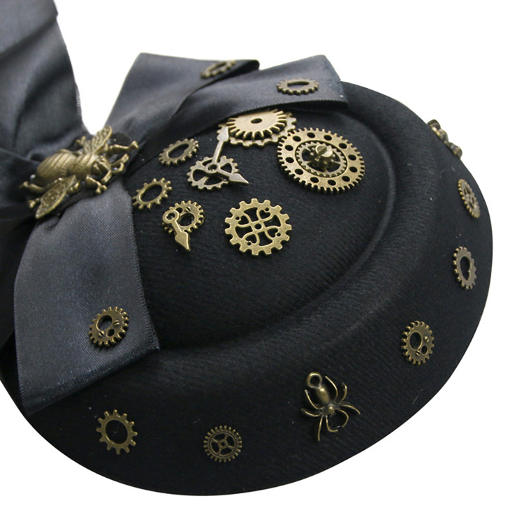 This Victorian Gothic Handmade Bowler-hat Hair Clip features: black floral lace and bowknot Fascinator, Industrial Style bronze metallic color gears embellished on the hat, two little hair clips under the hat well fixed on the head. Perfect accessory for Gothic or Steampunk theme party, cosplay, Halloween, ball, Masquerade and other occasions.