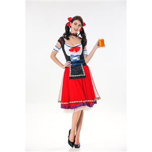 4pcs, Sexy Pretty Beer Girl Bavarian Costume includes a knee length dress with white ruffled bust, red bow accent, thick black shoulder straps with red embroidery, blue lace-up bodice, and an attached black apron with colorful detailing and sheer mesh overlay, with concealed back zipper, and matching detached puffed sleeves, a bib, and bow hair clips. (Shoes, stockings and beer not included.)