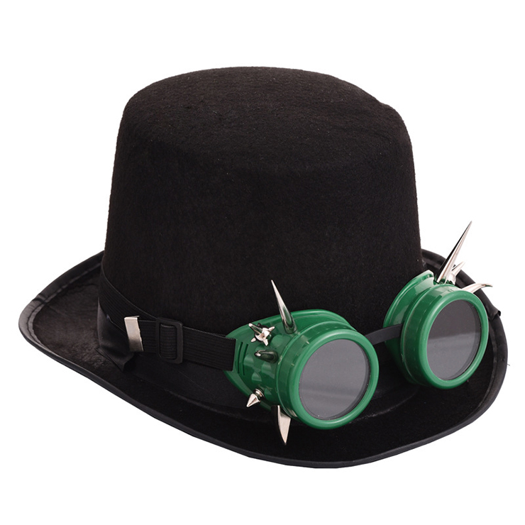 This Unisex Steampunk Handmade Top Hat features: fashion removable green plastic goggles, vintage Industrial rivets detail. Perfect accessory for steampunk theme party, cosplay, Halloween, ball, Masquerade and other occasions.