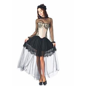 This Corset Blouse Skirt Set features: with black lace trimming in the top and side, ruffles around bust, busk closure in the front, lacing in back for cinching,matching sexy black polka dots long sleevees blouse and high-waisted gauze skirt.(Hat and shoes are not included)