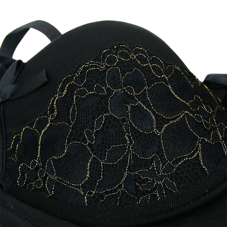 This Sexy Bustier Corset features: made of soft and stretcy sheer mesh, gold-edged flowers black lace design on the front,adjustable spaghetti straps, deep V padded bodice with bowknots, 7 plastic bones for support and shaping, hook and eye closure on the back, matching garters and g-string. (Stockings, necklace and hat are not included)