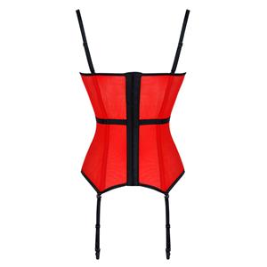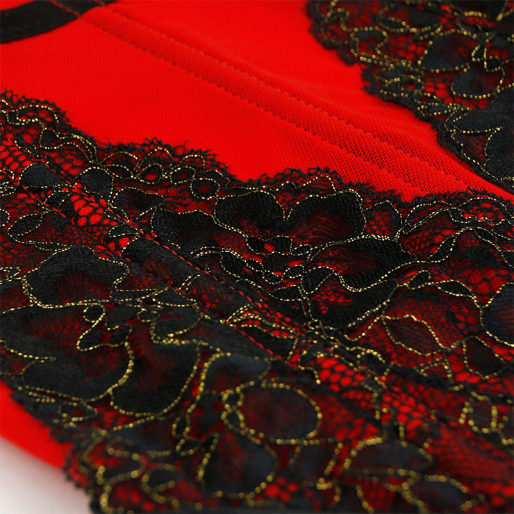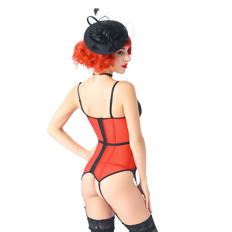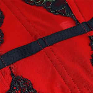This Sexy Bustier Corset features: made of soft and stretcy sheer mesh, gold-edged flowers black lace design on the front,adjustable spaghetti straps, deep V padded bodice with bowknots, 7 plastic bones for support and shaping, hook and eye closure on the back, matching garters and g-string. (Stockings, necklace and hat are not included)