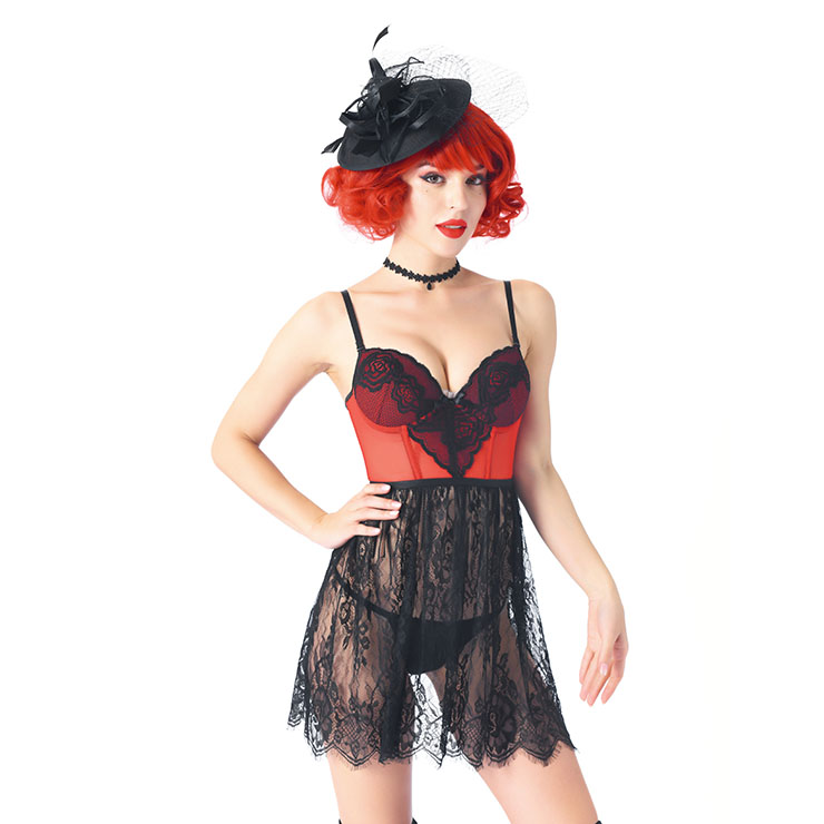 This Sexy Babydoll Lingerie features: made of soft fabric, adjustable spaghetti straps, deep V padded bodice splice black sheer floral lace skirt,6 plastic bones for support and shaping, hook and eye closure on the back, matching g-string. (Stockings, necklace and hat are not included)