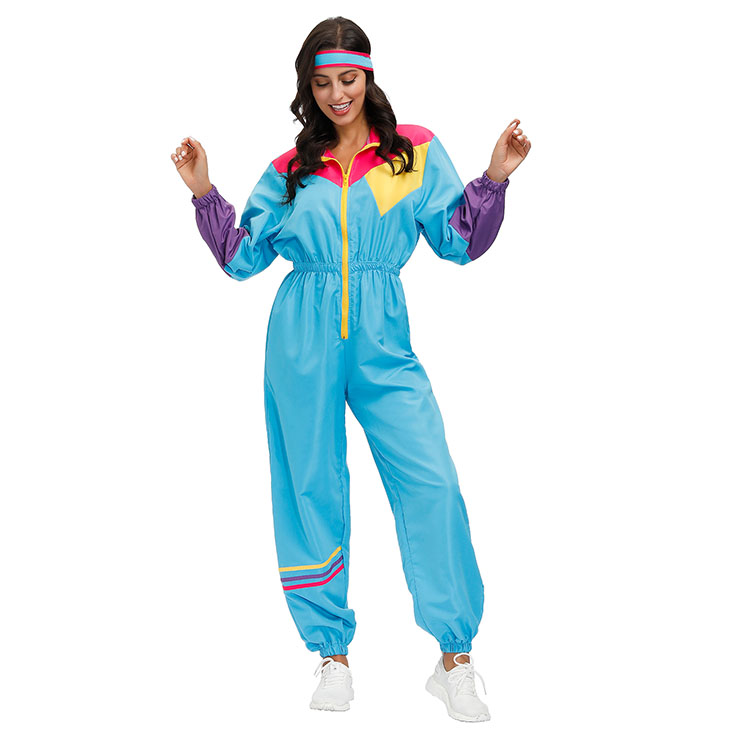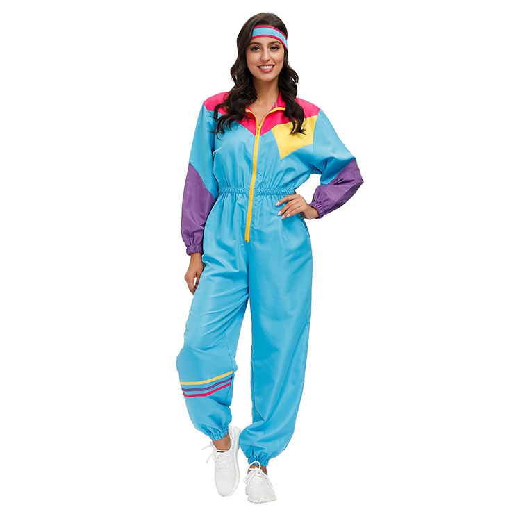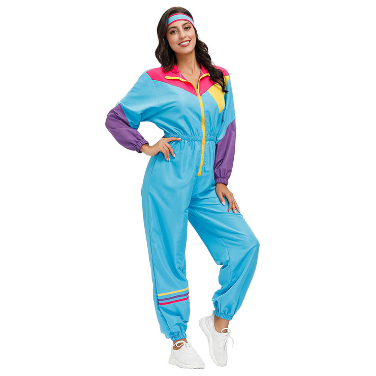 2Pcs, Colorblock Adult Hippie Costume with long sleeves,smocked waist, front zipper closure,elasticized cuffs and bottom, matching the same style headband.Suitable for casual, party, cosplay, dance and more.