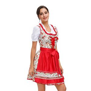 This Women's Oktoberfest Beer Girl Adult Costume features: white round neck and short sleeves top with lace trim, floral print mini dress top with red neckline ruffles and front lace-up detailing, matching with red apron.( Beer is not include)