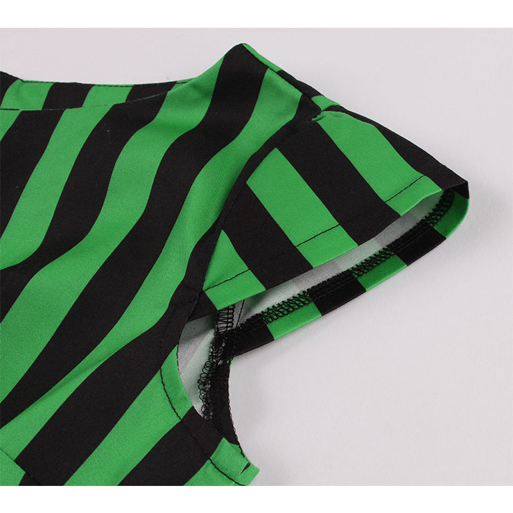 This retro swing dress featuring simple round neck and cap sleeves, high waist and ruffled design, black and green stripes cover the whole dress, back concealed zipper closure, A-line skirt and midi length design make you look elegant and beautiful, matching belt. Suitable for dating, picnic, office, cocktail party, daily casual and other occasions.