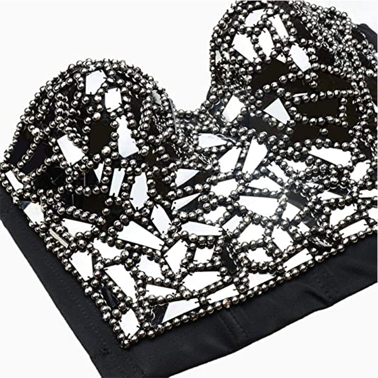 This sexy clubwear bra featuring crop top design, rock style, underwire padded bra, adjustable and detachable shoulder straps,4 rows hook and eye closure back, with silver-gray sequins and beads embellished overlay the whole bustier. Excellent for clubwear, night out dancing, party, cosplay, halloween, bar, friend gathering and so on.