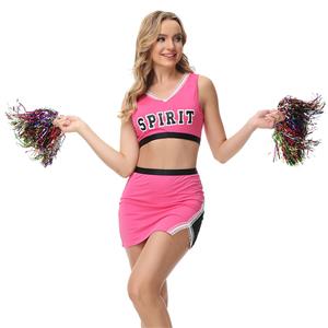 3pcs. This sexy cheerleader costume includes a tank crop top with "SPIRIT" logo, white ruffle trims decorated, matching a high waisted mini skirt with side split design, includes two pom-poms.