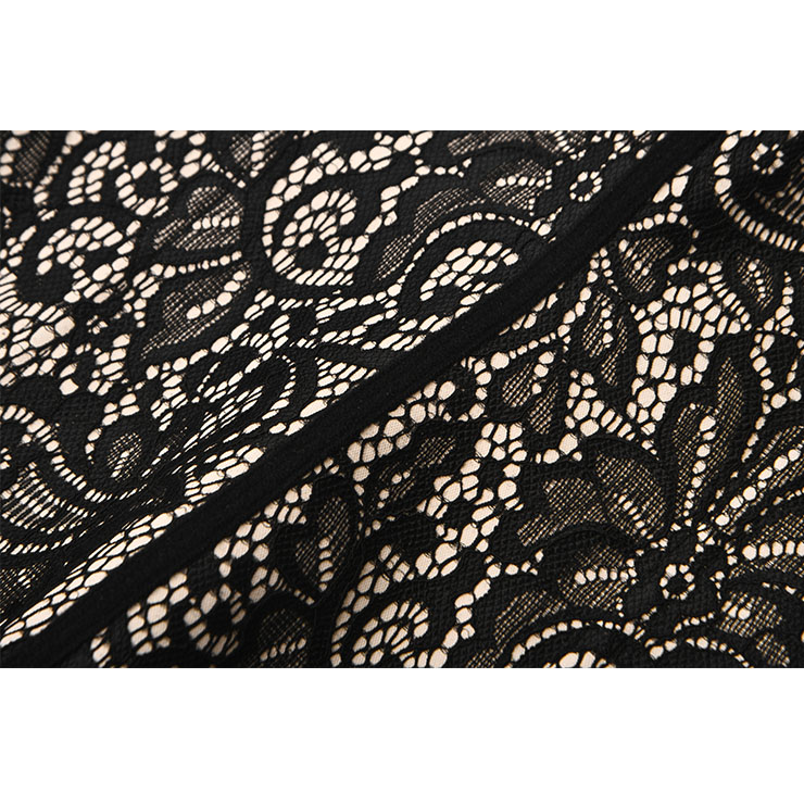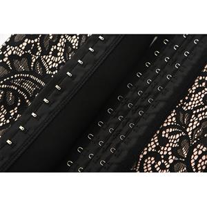 This sexy black waist cincher corset features built-in 4 steel boned, delicate black floral lace overlay with beige underlay, three lines hook and eye closure in front, g-string not included.