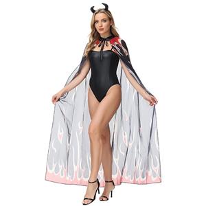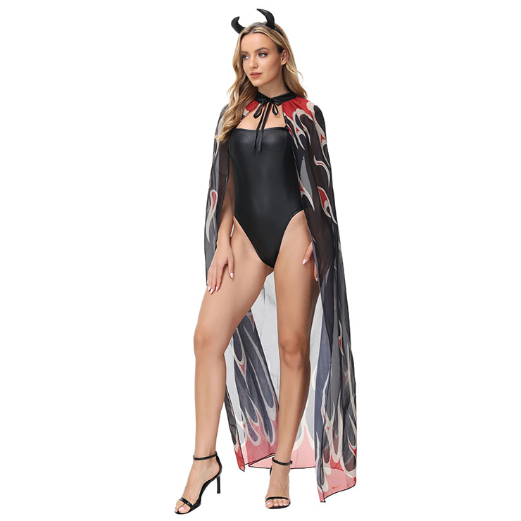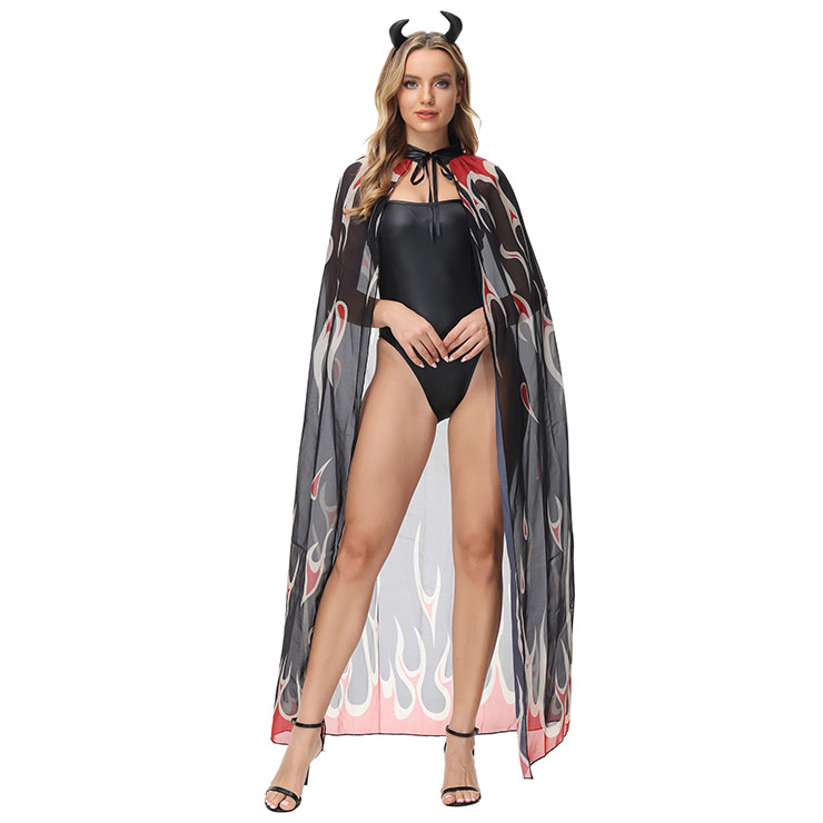 This Sexy Devil Costume features: super tempting elastic bodysiut, spaghetti straps and high leg cut design, sheer mesh cloak with gold stamping buring fire pattern, matching devil's horn headpiece.