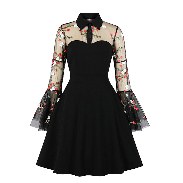 This women's sexy black retro dress features: wave lapel,see-through mesh floral embroidered flare sleeve and upper chest, stitching heart shape bust, A-line style, high waist and swing hemline design,concealed zipper at side. Perfect for Halloween, daily casual, cocktail, dating, outdoor, party and other occasions.