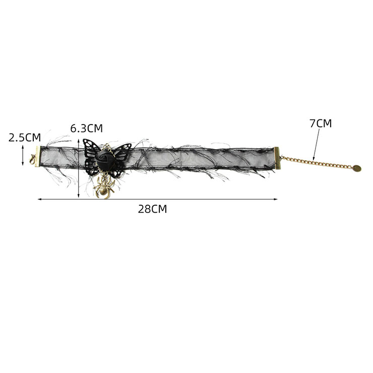 Black mesh choker with tattered detail just like the threads of a spider web, decorate with a black non-woven butterfly and rose in the middle, embellished with a metal spider pendant, high quality adjustable alloy chain and buckle closure. (Only the necklace).