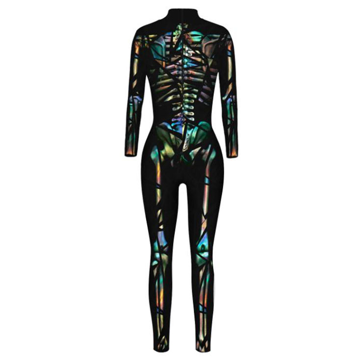 This scary bodysuit features: black elastic unitard with 3D digital printed laser color skeleton on whole body, so horrible and funny. Made of breathable and comfortable fabric, high neck, long sleeves and full length design, back zipper closure easy to wear.