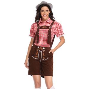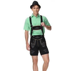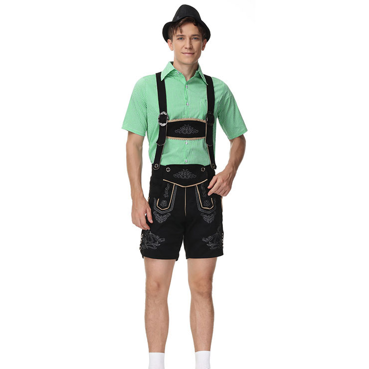 This Men's Traditional Bavarian Oktoberfest Costume comprises a green and white gingham lapel shirt with front button closure, and a pair of dungaree lederhosen with traditional bib front, buckles and buttons, lace-up detail on the back, traditional bavarian pattern throughout. Matching hat (Stockings and shoes are not included).