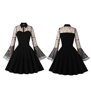 This women's sexy black retro dress features:long sleeve,wave lapel,see-through mesh pink butterfly flare sleeve and upper chest,stitching heart shape bust,A-line style,high waist and swing hemline design,concealed zipper at side.Perfect for Halloween,daily casual,cocktail,dating, outdoor,party and other occasions.