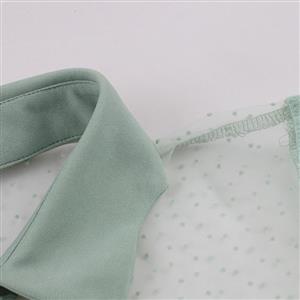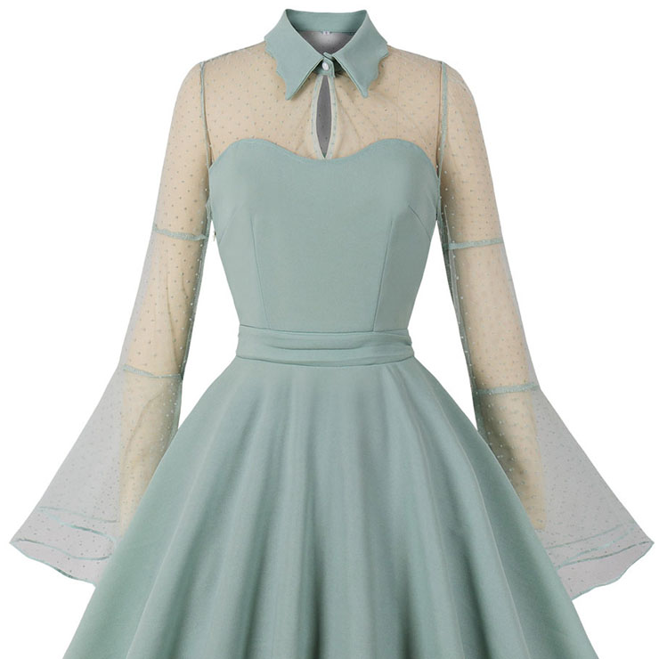 This women's sexy reseda retro dress features:long sleeve,wave lapel,see-through mesh round dot flare sleeve and upper chest,stitching heart shape bust,A-line style,high waist and swing hemline design,concealed zipper at side.Perfect for Halloween,daily casual,cocktail,dating,outdoor,party and other occasions.