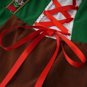 Women's Beer Girl Oktoberfest Serving Adult Costume featuring a green cute dress with same color corset look bodice with elastic ruffled off shoulder neckline and cuff, shoulder straps, a red lace-up detailing at front and attached brown apron, distinctive national and folk stripes decorated on the dress, bulit in with a white crochet lace layer, concealed zipper at back(The petticoat not include).